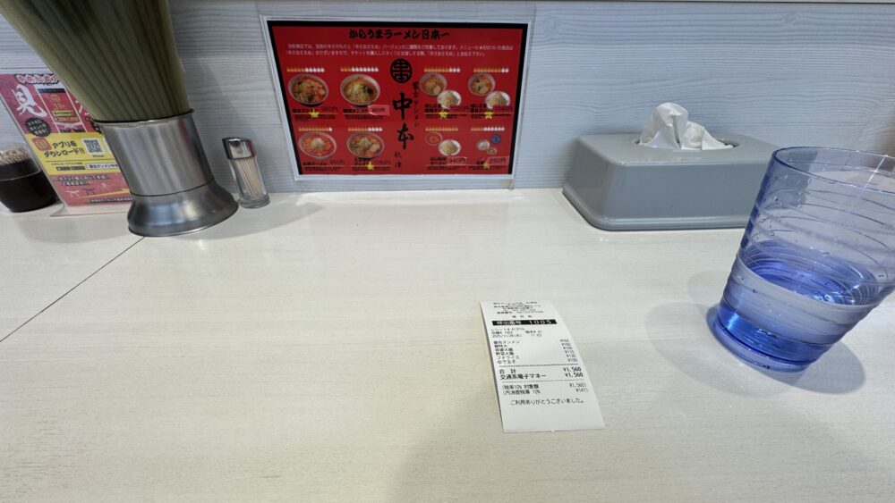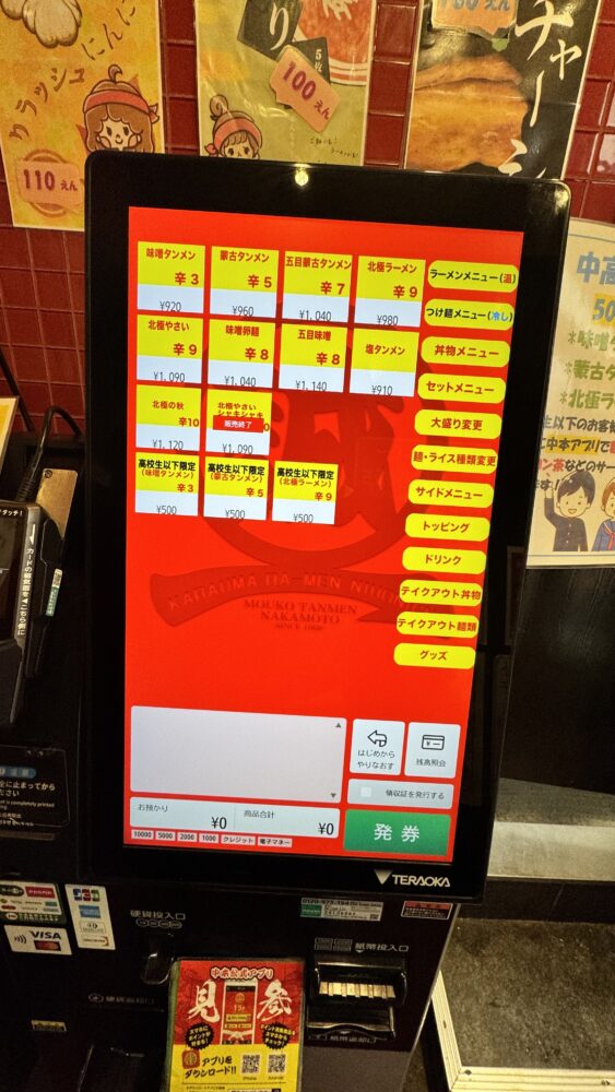 このタイミングで蒙古タンメン中本のアプリを見せ、ポイントをためてもらう+使いたいクーポンを申告すると良いです。