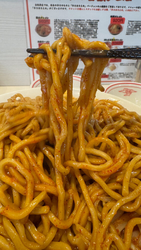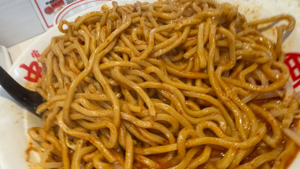 ▲中本のコシがあるストレート麺。かなり北極スープを吸って辛旨。後半はほぼ汁なしみたいな状態です。