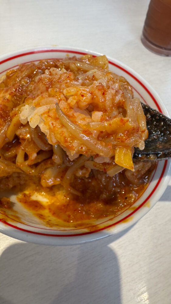 ▲豚骨ベースの北極スープを吸い込んだライスが辛旨。腹パンでしたが、旨すぎてかきこみました。