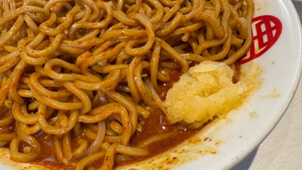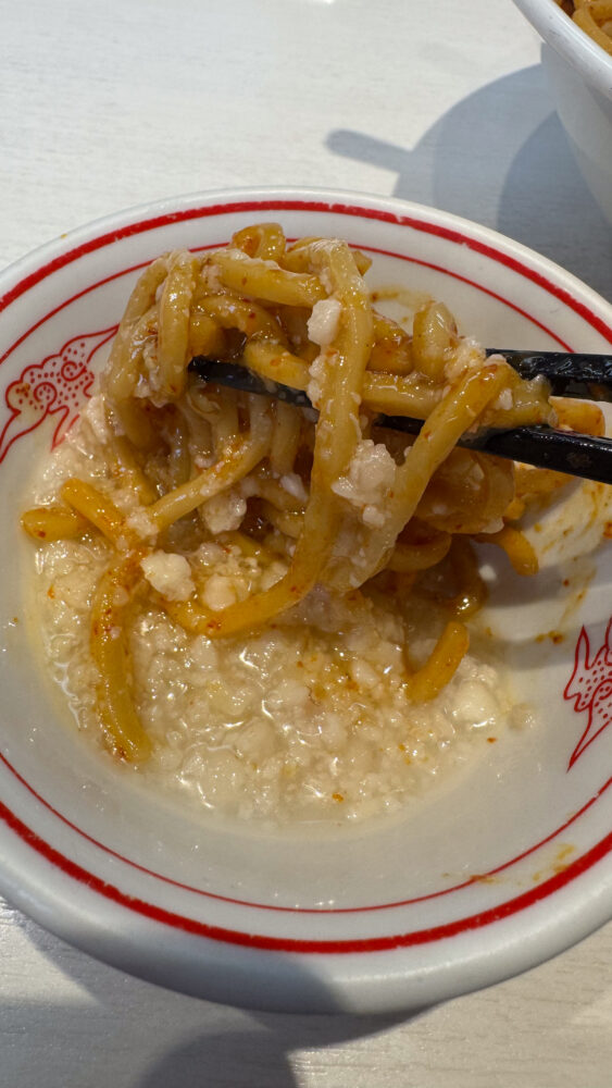 ▲別皿の背脂に麺をディップして味変。中本の背脂はマイルドなので、一気に辛味が中和されるとともに動物系の旨味が加わって旨い。