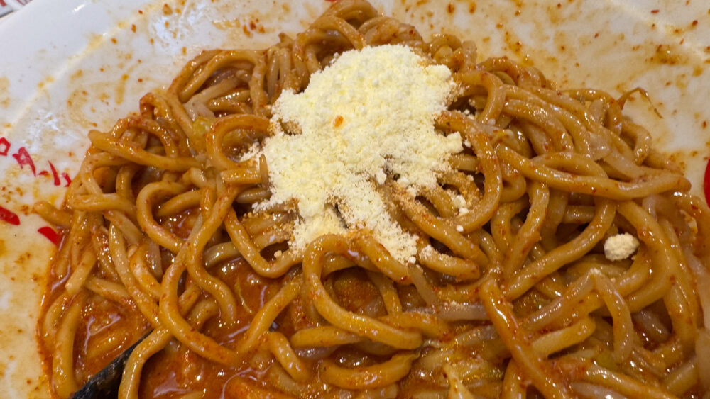 ▲終盤は別皿の粉チーズで味変。粉チーズ部分は不思議と辛めのパスタ感があって美味しい。