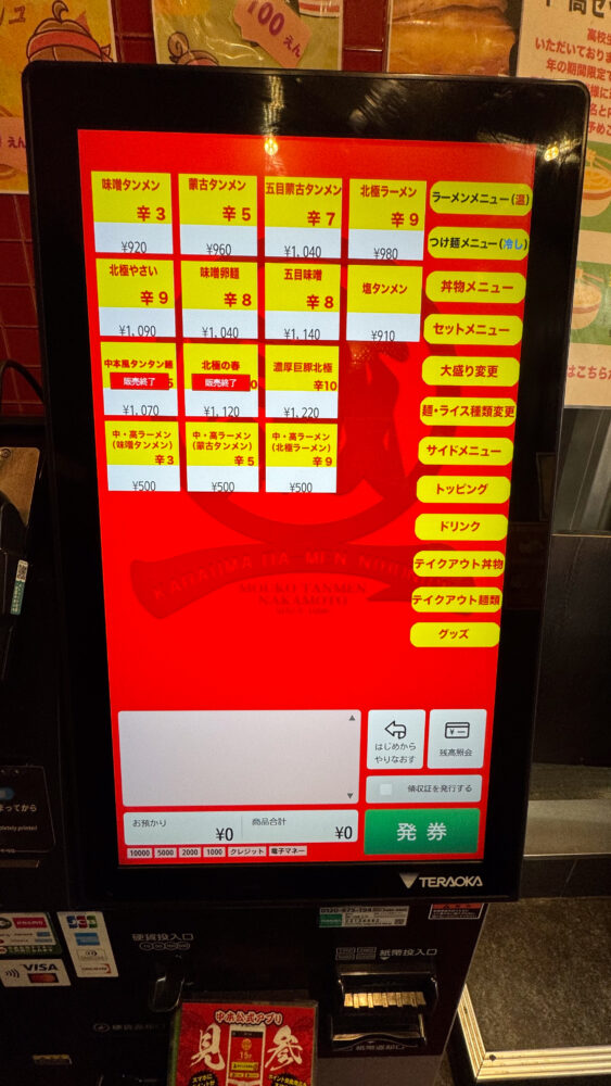 このタイミングで蒙古タンメン中本のアプリを見せ、ポイントをためてもらう+使いたいクーポンを申告すると良いです。
