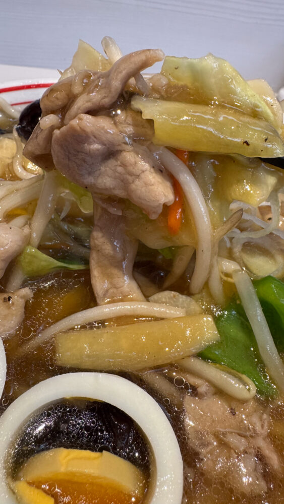 ▲あんかけは豚肉やキャベツ、ピーマン、もやし、メンマなど具沢山。味はしっかりめで美味。