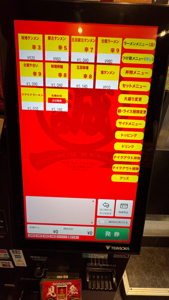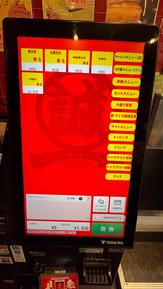 このタイミングで蒙古タンメン中本のアプリを見せ、ポイントをためてもらう+使いたいクーポンを申告すると良いです。