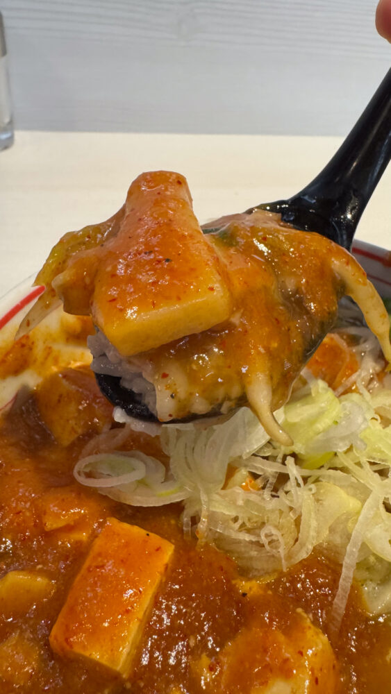 ▲続いて境界線部分。あんかけの具材・塩味と麻婆丼の辛旨が合わさって美味しい。