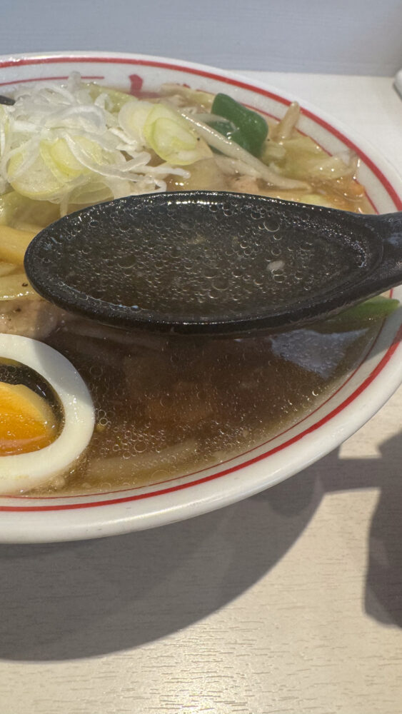▲スープは、あっさり系の醤油。あんかけのとろみと塩味が入ると味わいも変わります。