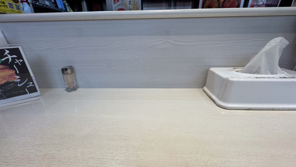▲以前はあった卓上調味料はなし。店員さんへお願いすると紅生姜、お酢、一味唐辛子等を持ってきてくれるみたいです。