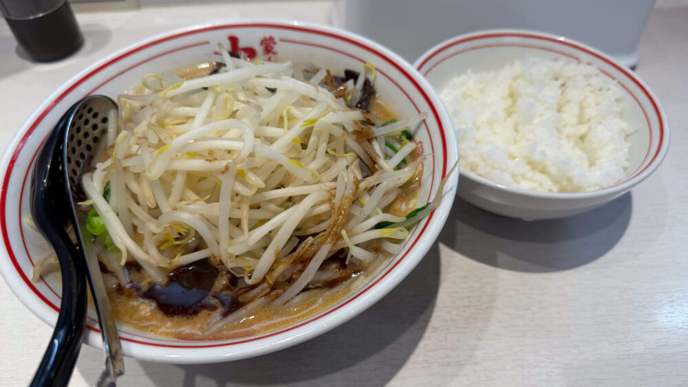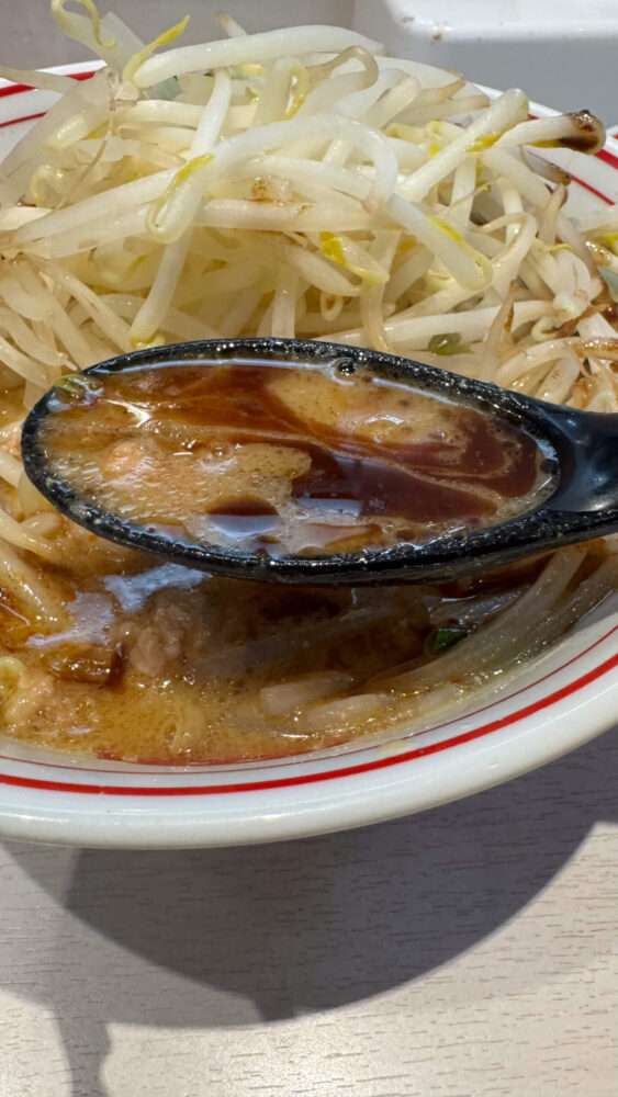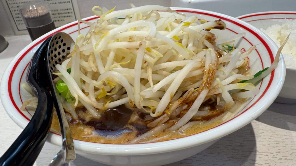 どっさり乗ったもやしと中本らしからぬ味噌色のスープに黒いマー油が印象的な一杯!