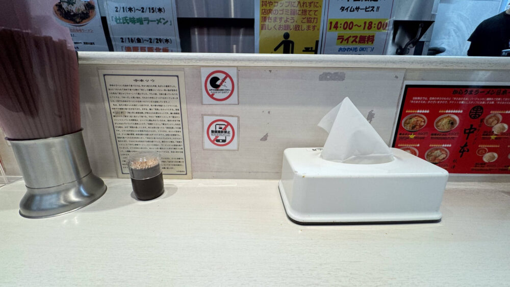 ▲以前はあった卓上調味料はなし。店員さんへお願いすると紅生姜、お酢、一味唐辛子等を持ってきてくれるみたいです。
