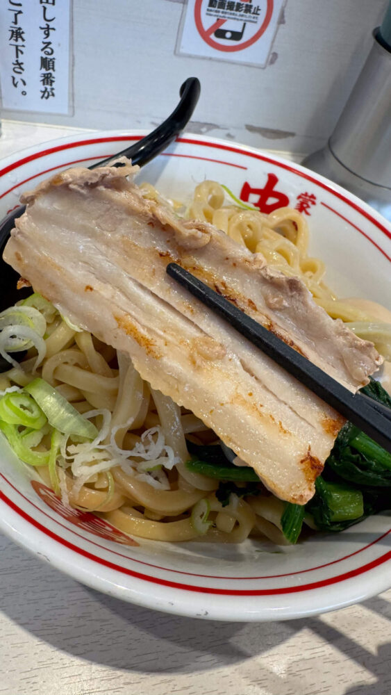▲チャーシューは大きめでほんのり炙られています。つけ汁に浸して食べると旨し。