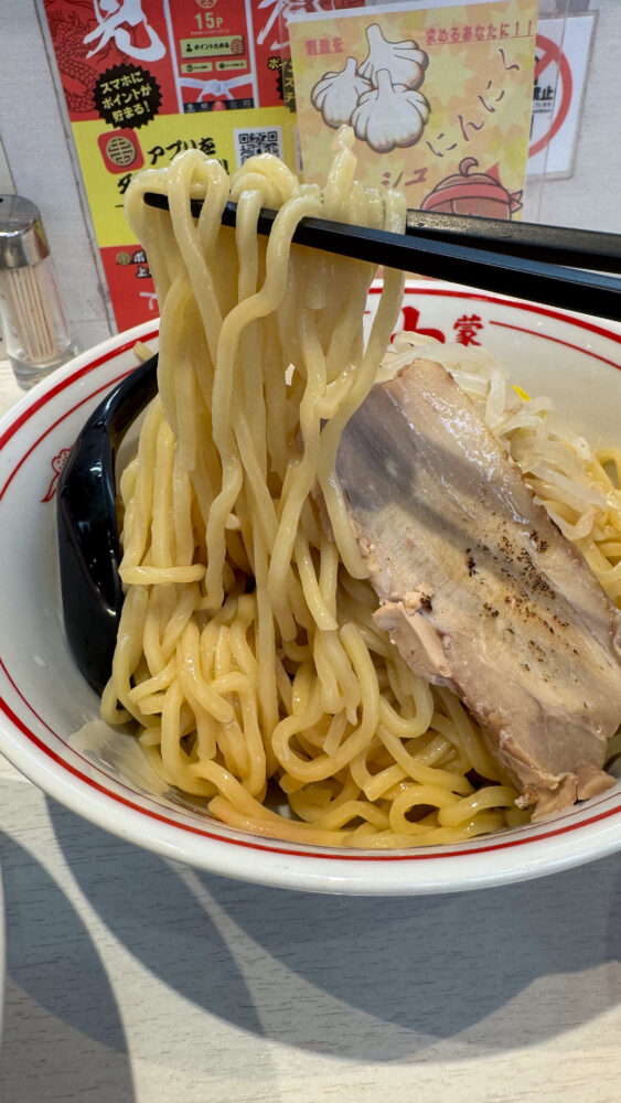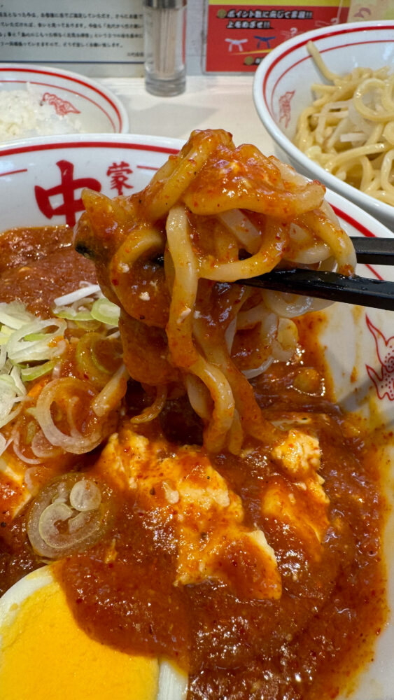 ▲中本の中太麺が水でしっかり締められていて弾力強め。