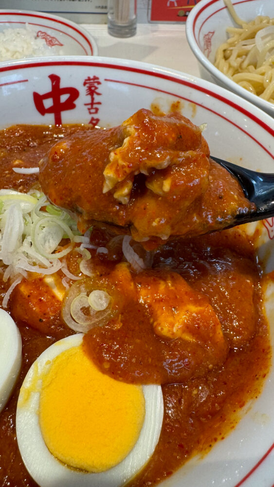▲麺をつけ汁に投入。粘度が高いので、麺に麻婆豆腐がめちゃくちゃ絡みまくって激ウマ。