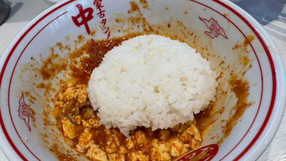 ▲麺を食べ終えたら、半ライスを麻婆豆腐の丼へ投入。いつもはライス側へスープやつけ汁を投入しますが、今回は逆パターン。