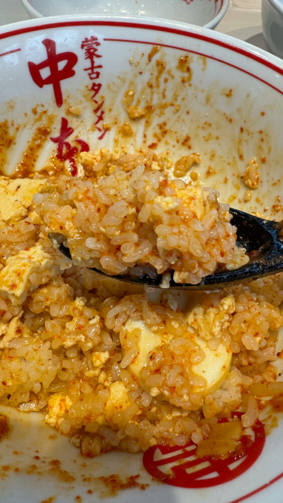▲よく混ぜ合わせると、麻婆丼風の雑炊に。最後まで余すところなく辛旨でした。