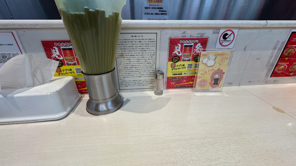 ▲以前はあった卓上調味料はなし。店員さんへお願いすると紅生姜、お酢、一味唐辛子等を持ってきてくれるみたいです。