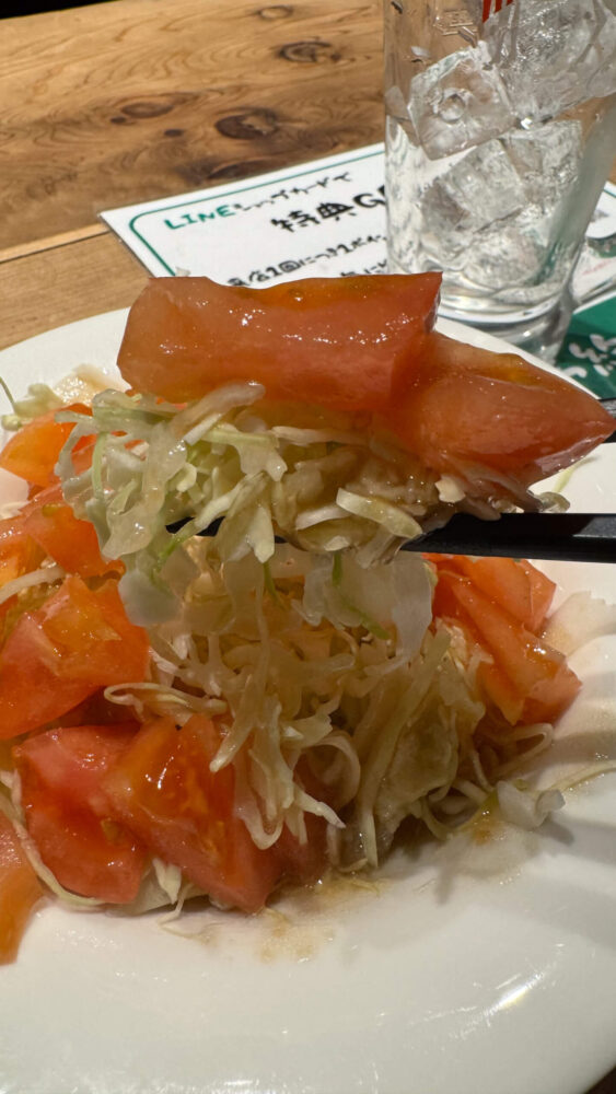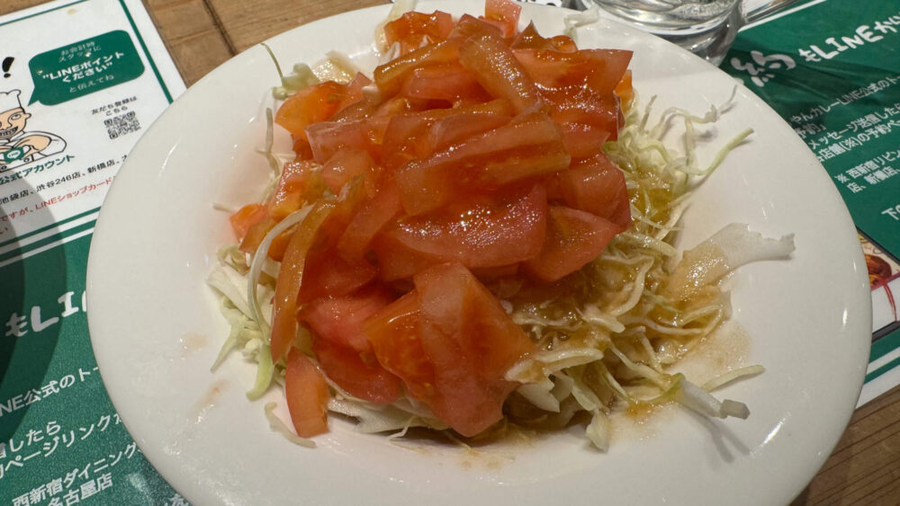 ▲続いてもうやんサラダ。トマトとキャベツのオーソドックスなサラダといった感じ。