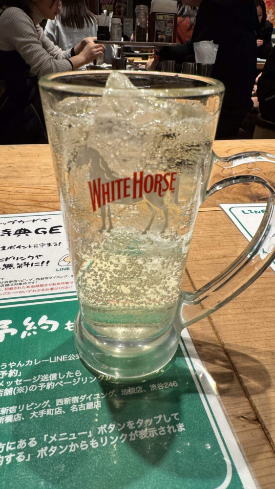▲1杯目はハイボール!ホワイトホースですね。安定の美味しさ。