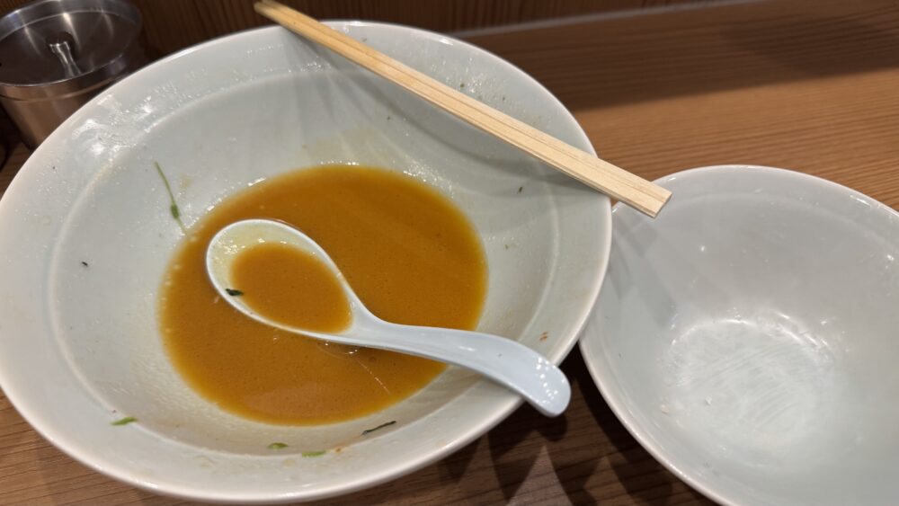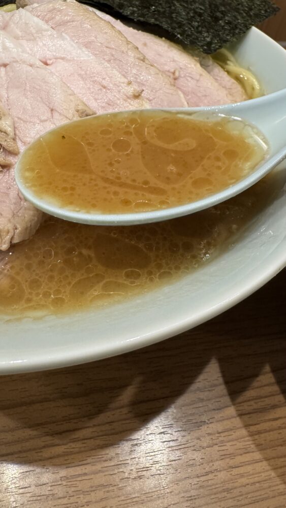 ▲濃いめ・多めにしたスープはしっかり濃厚。ライスが進むしょっぱ旨な味わいでどストライク。