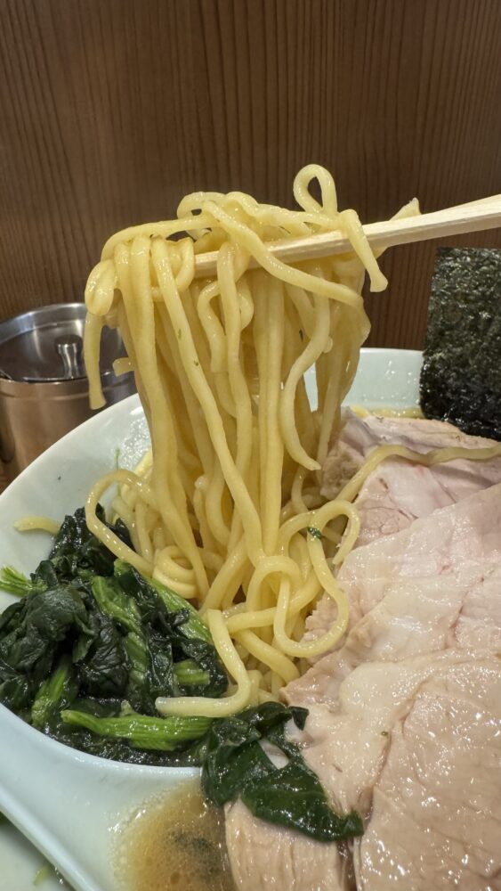 ▲硬めにした麺は、ほどよい弾力。大盛は麺量多めなので、伸びないうちにズルズルすすります。