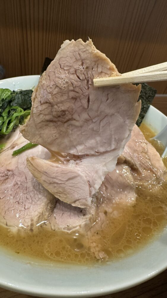 ▲チャーシューは、ムチっと食感で美味。チャーシューメンにチャーシュー増ししたので6枚あって最高。