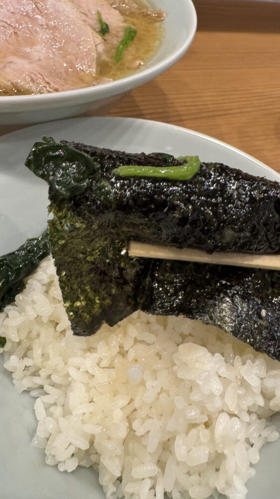▲海苔も、しょっぱ旨なスープに浸し、ライスで巻けば激ウマ。磯感が良いアクセント。