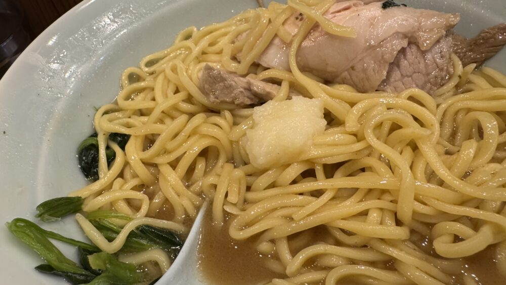 ▲卓上のおろしにんにくで味変。あまりスープに混ぜないようにダイレクトで食べると刺激的でめちゃ旨。