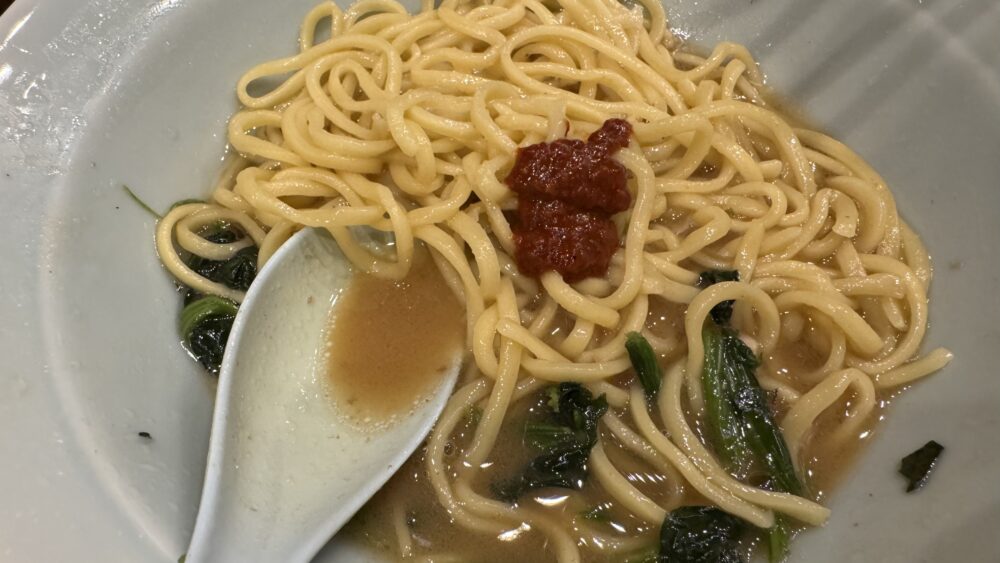 ▲続いて卓上の豆板醤で味変。旨辛になり、終盤でも美味しく食べ進められますね。