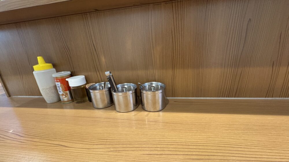 ▲卓上調味料はラーメンコショー、すりごま、お酢があります。さらに、カウンターにはかっぱや刻みショウガ、豆板醤などもあります。