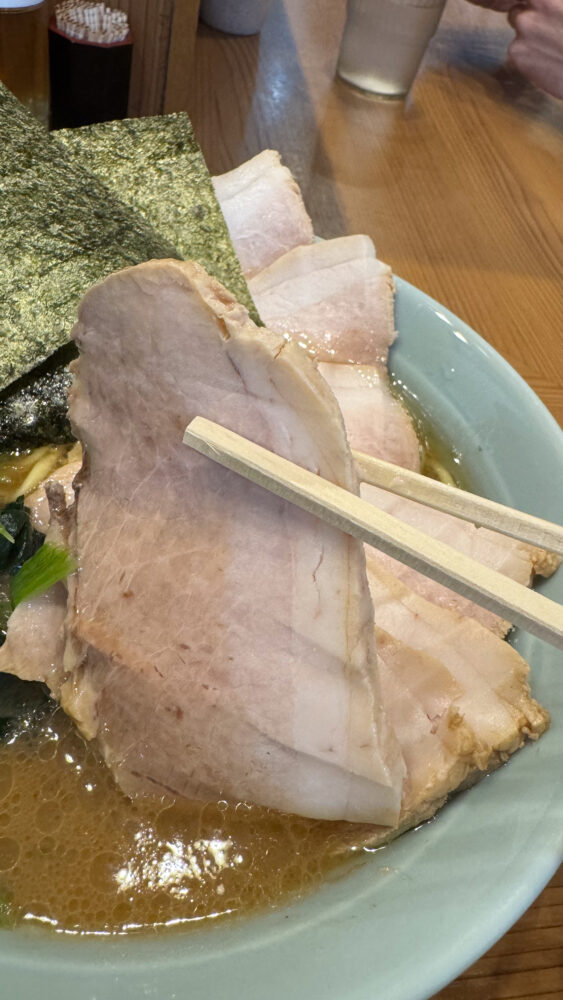 ▲チャーシューは厚めでムッチリ食感の旨さ。濃厚スープに浸して食べるとより旨し。