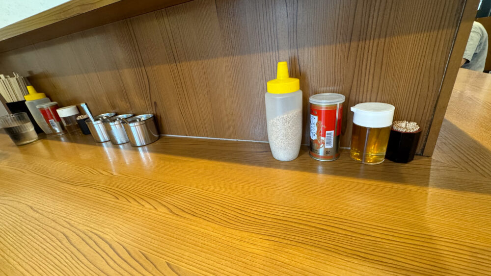 ▲卓上調味料はラーメンコショー、すりごま、お酢があります。さらに、カウンターにはかっぱや刻みショウガ、豆板醤などもあります。