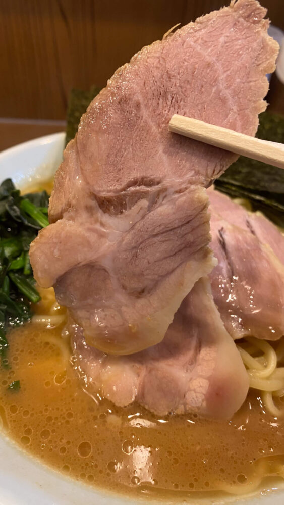▲チャーシューはかなり大きめ。ムチっと食感で美味。スープに浸して食べるのが好きです。