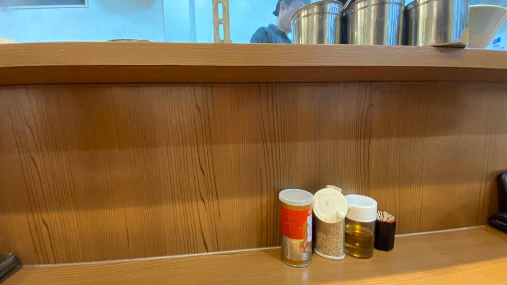 ▲卓上調味料はラーメンコショー、すりごま、お酢があります。さらに、カウンターにはかっぱや刻みショウガ、豆板醤などもあります。