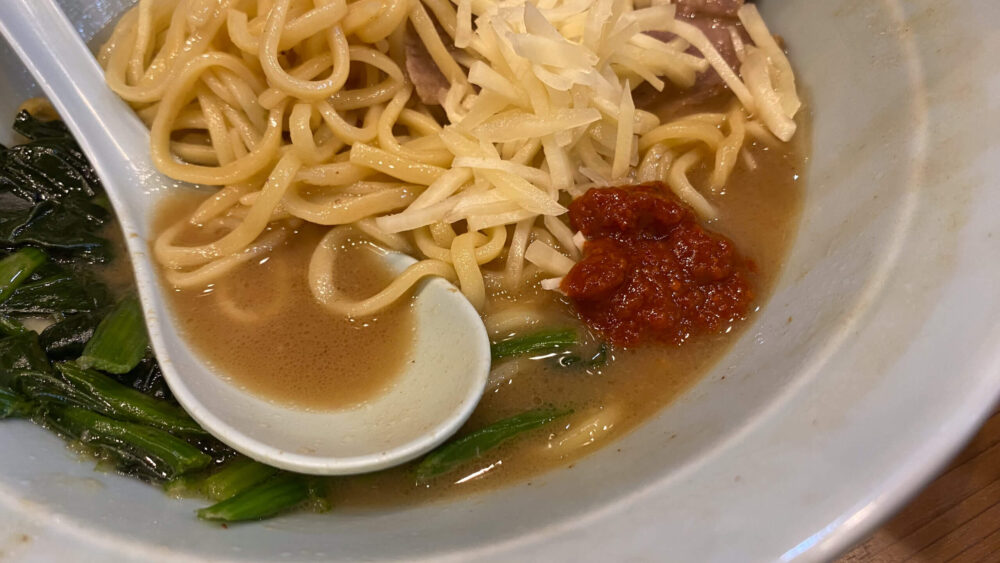 ▲終盤は、卓上の刻みショウガと豆板醤で辛さと酸味を増してラストスパート!