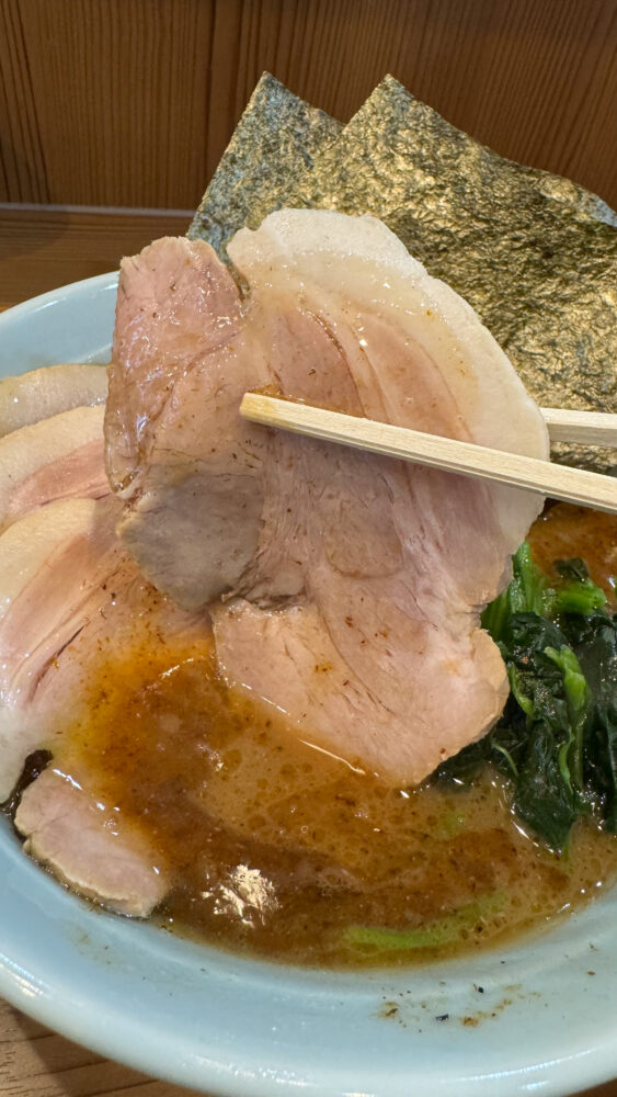 魚介豚骨ラーメンが着丼!4枚の大きめチャーシューに、明らかに魚粉的な仕様になったスープが美味しそう!