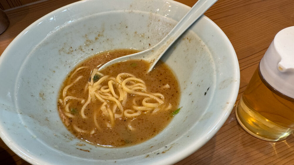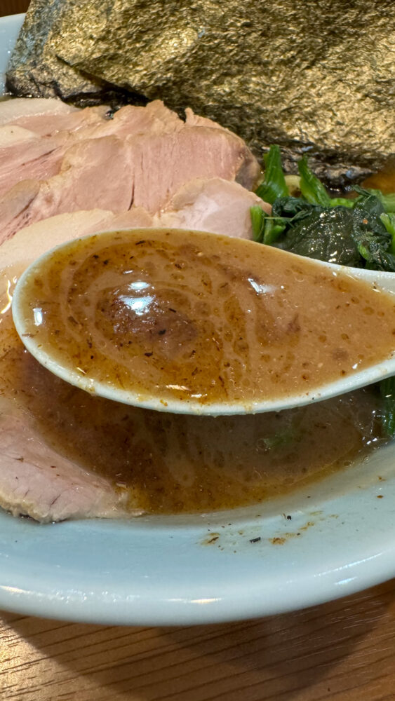 ▲スープはビシッと魚粉が効いてめちゃ旨。動物系と魚介のダブルの旨味が身体に染み渡ります。