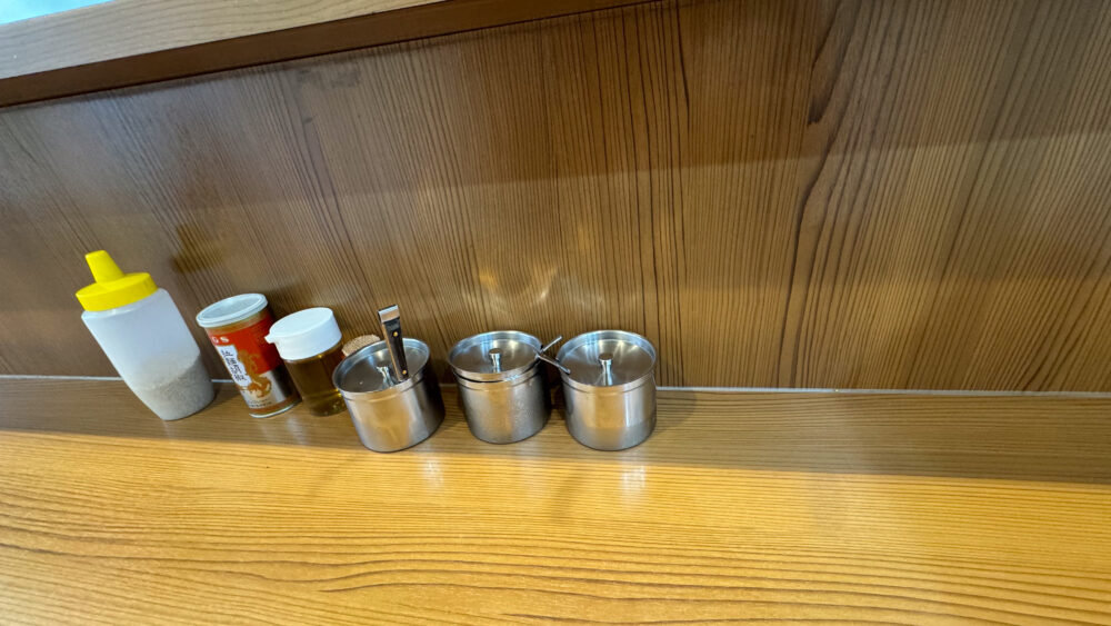 ▲卓上調味料はラーメンコショー、すりごま、お酢があります。さらに、カウンターにはかっぱや刻みショウガ、豆板醤などもあります。