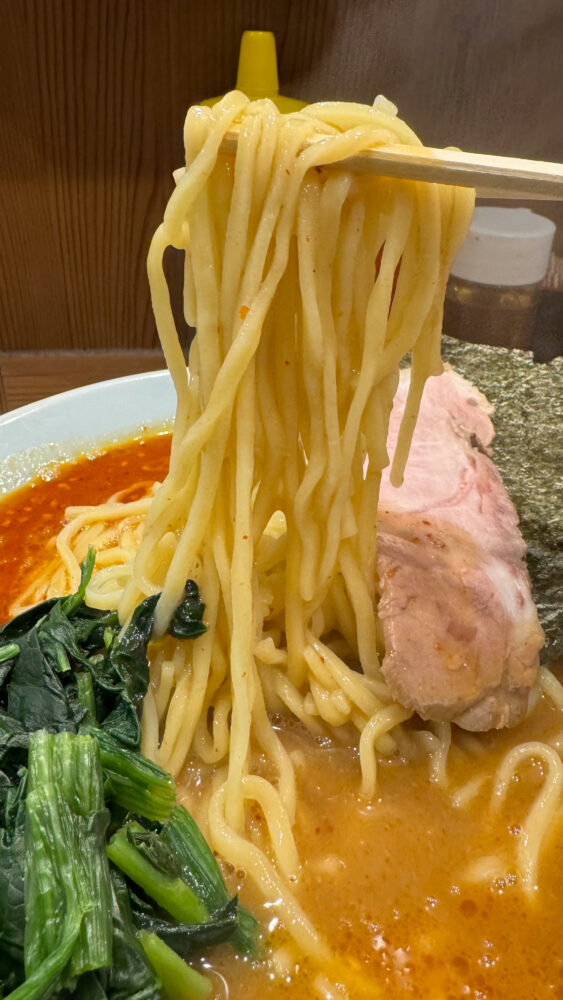 「うま辛」というだけあって赤みのあるスープが印象的な家系ラーメンですね!