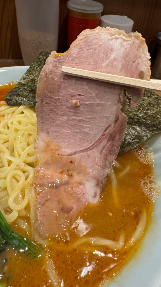 ▲チャーシューはかなり長くて大きいサイズ。武蔵家のムチっと食感のチャーシューは好きなタイプです。