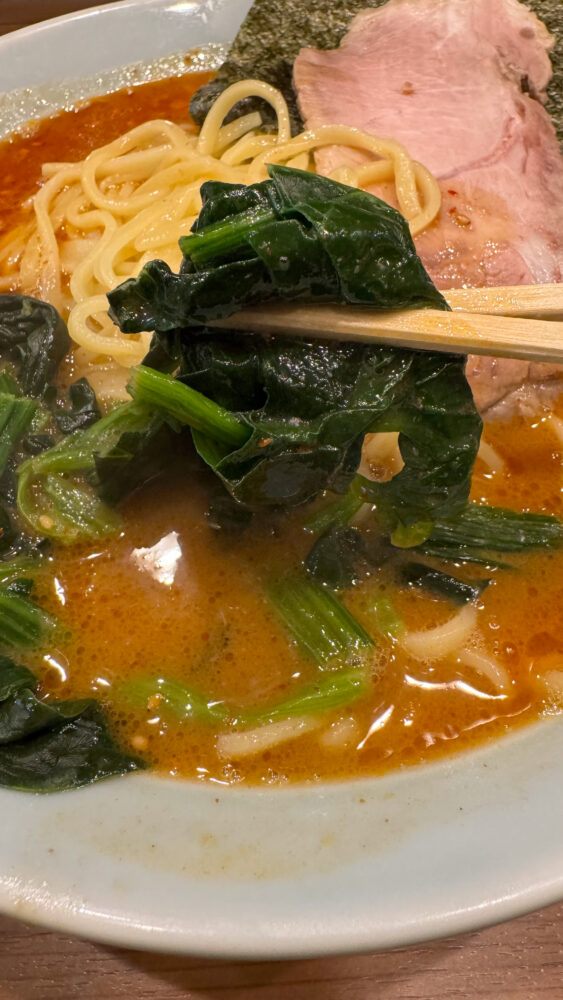 ▲ほうれん草はスープにしっかり浸って美味しい。ほうれん草を美味しく料理するメニューの中で、個人的に家系ラーメンが上位です。