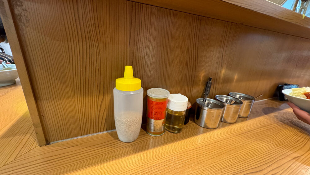 ▲卓上調味料はラーメンコショー、すりごま、お酢があります。さらに、カウンターにはかっぱや刻みショウガ、豆板醤などもあります。