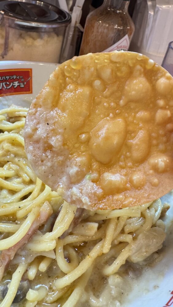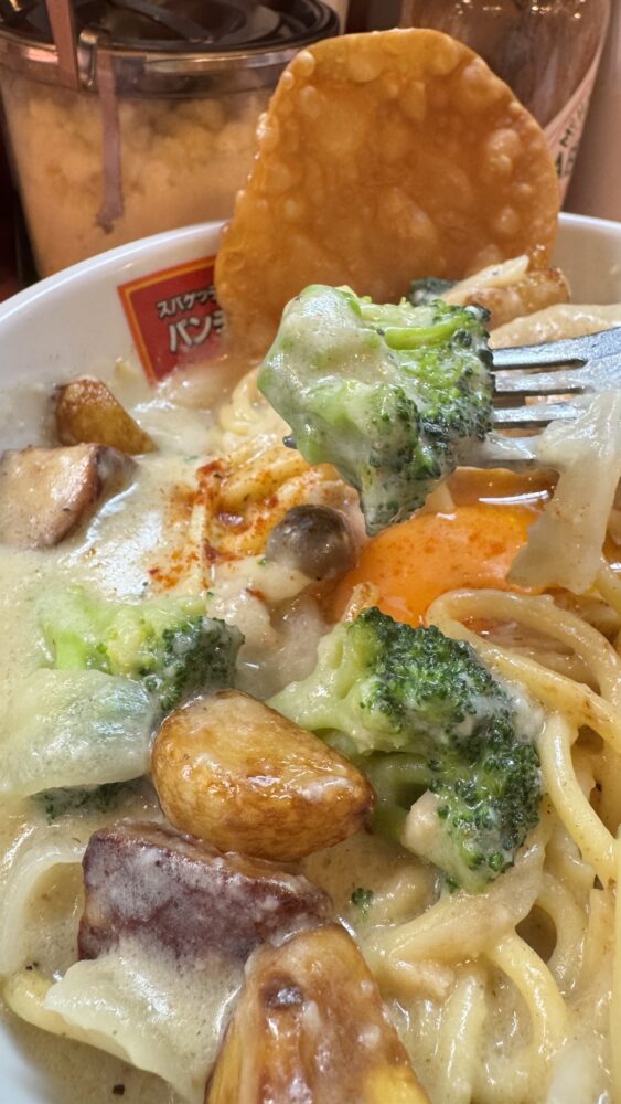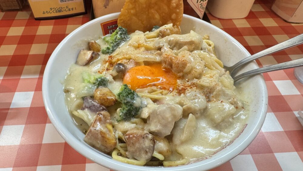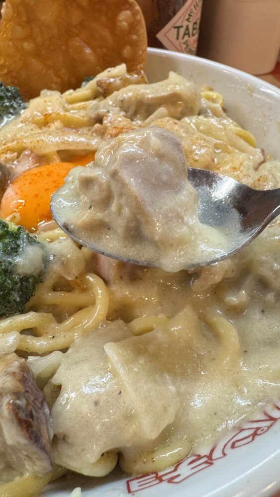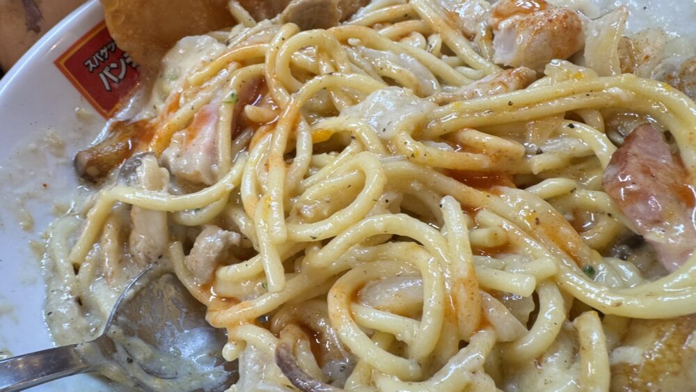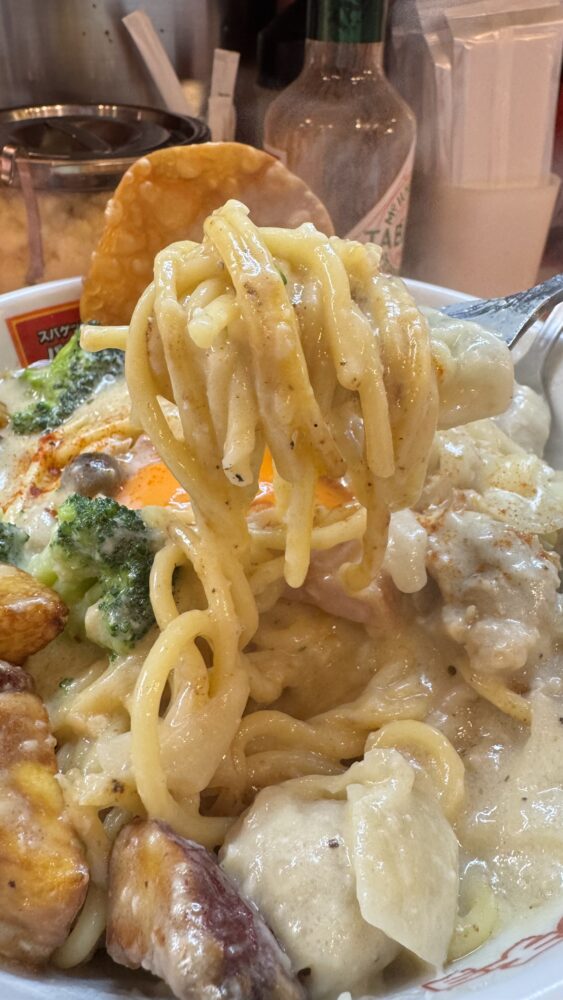 ▲パンチョ特有のモチッと食感な太麺に濃厚なクリームがたっぷり絡んで美味。