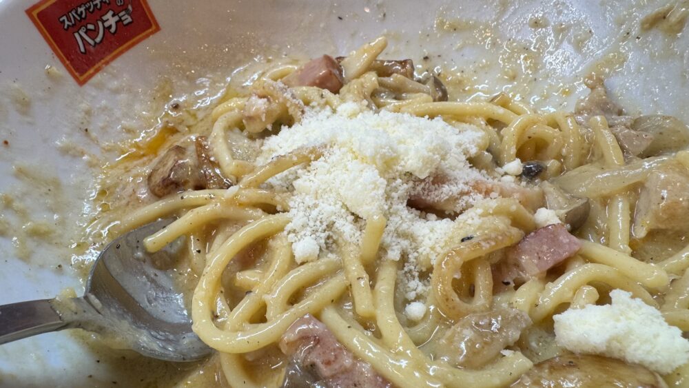 ▲卓上の粉チーズで味変。よりチーズ感が増し、もったりした麺が悪魔的な旨さ。