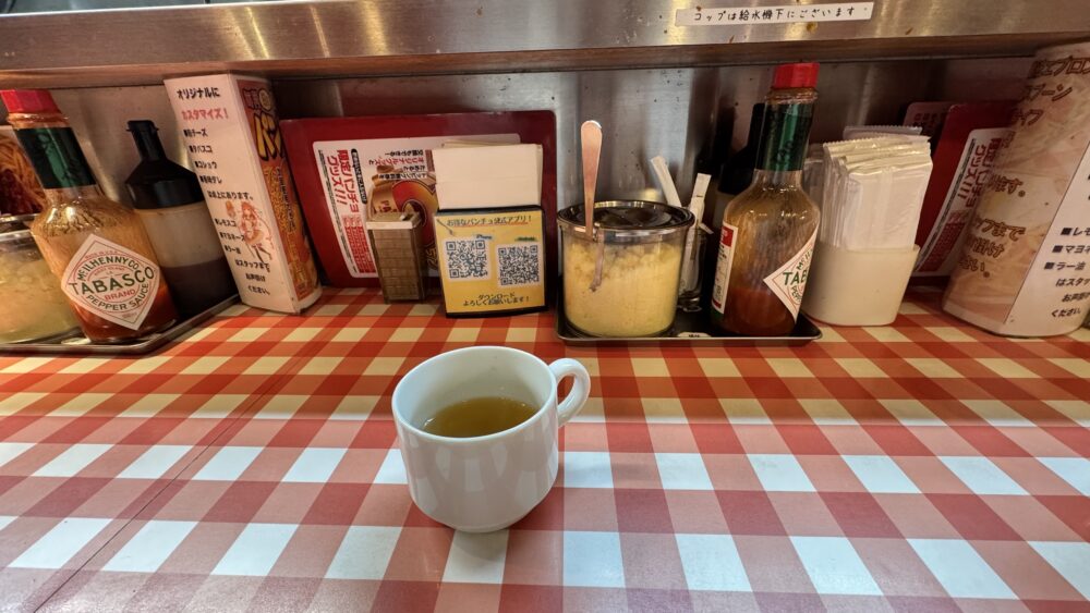 ▲卓上のタバスコで味変。辛味・酸味が加わって味が引き立ちます。