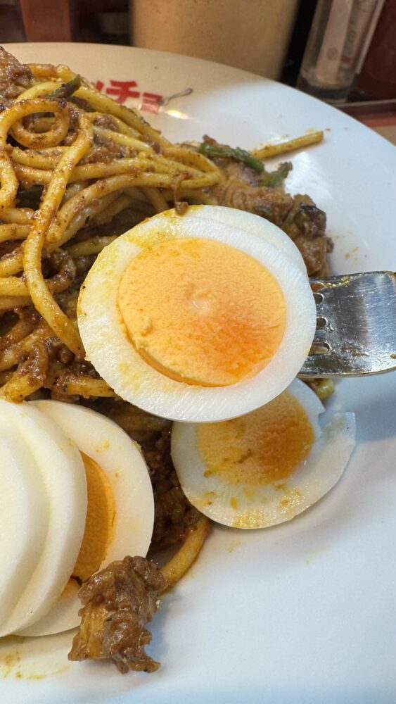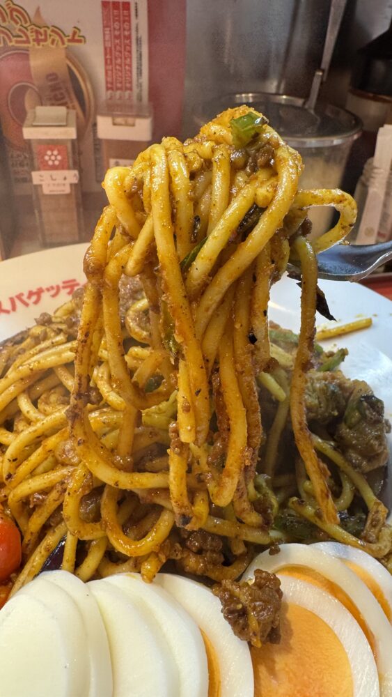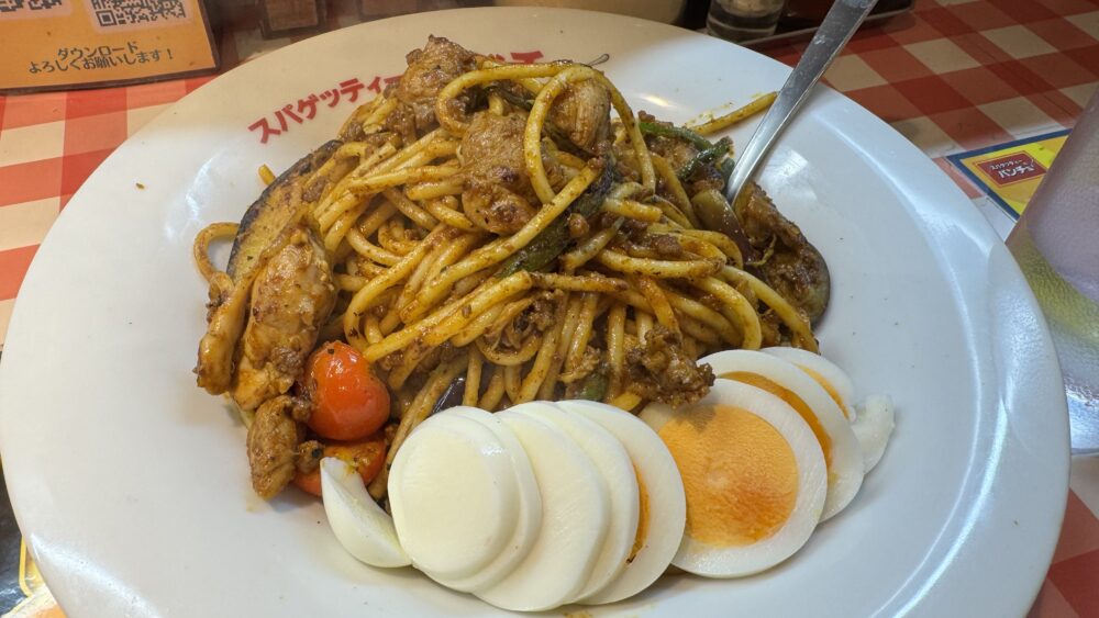 パンチョのゴロッとチキンのカレーナポは、スパイシーなカレーソースをまとったモチっと食感の太麺が美味しかったです!