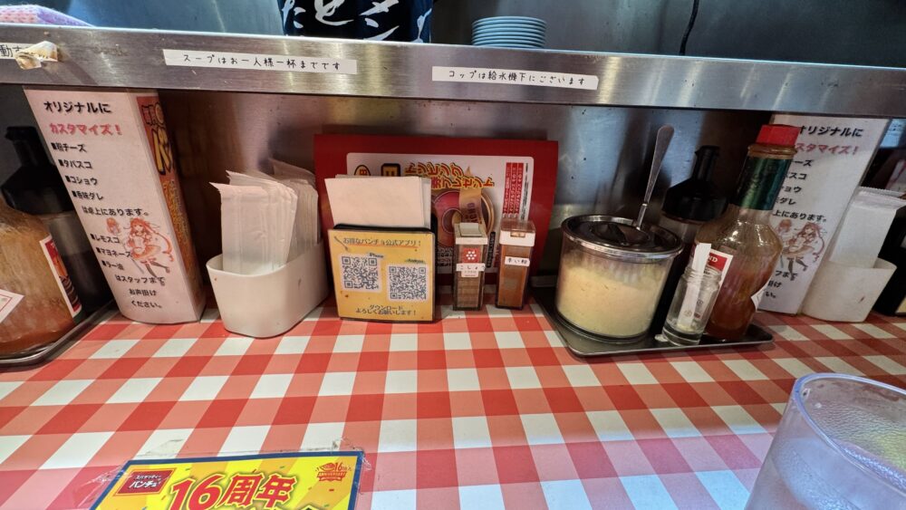 ▲卓上調味料は粉チーズやタバスコ、ブラックペッパーなどが用意されています。