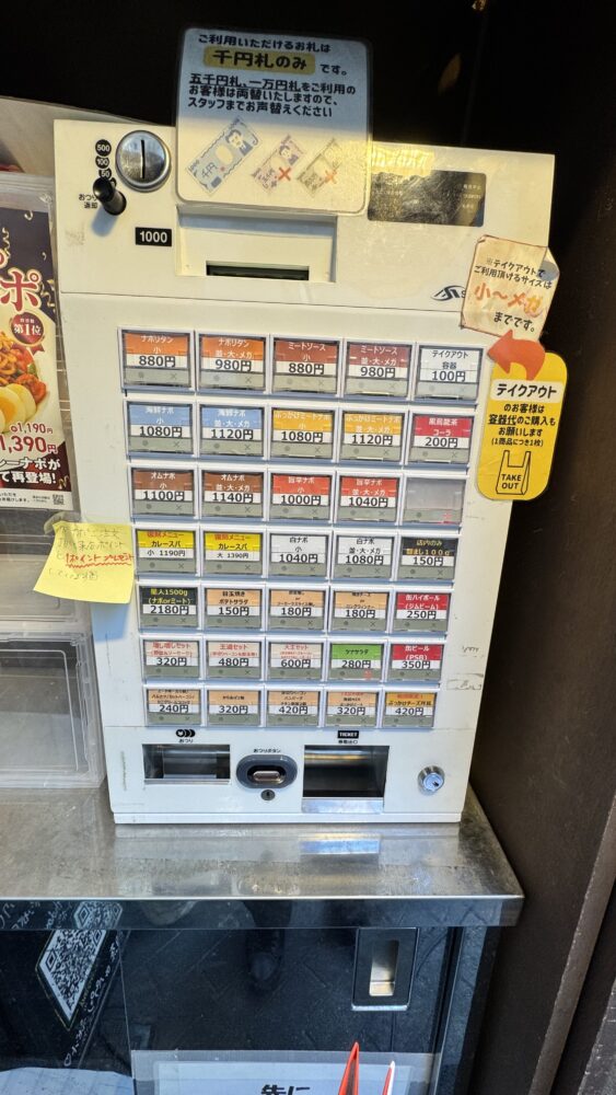 ▲店外の券売機で注文します。電子マネーが使えないタイプ(現金オンリー)で残念。