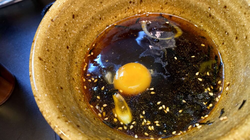 ある程度食べ進めたら、無料の生卵をつけ汁へ投入!