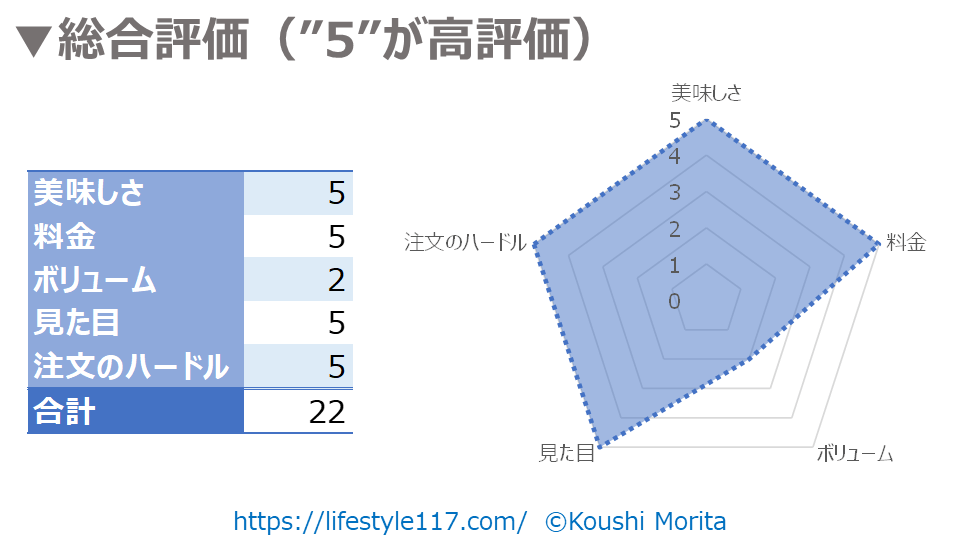 一方、「料金」は1,000円以下を”5”、あとは1,000円単位でスコアリング、「ボリューム」は2,000g以上を“5”、あとは500g単位でスコアリングしています。