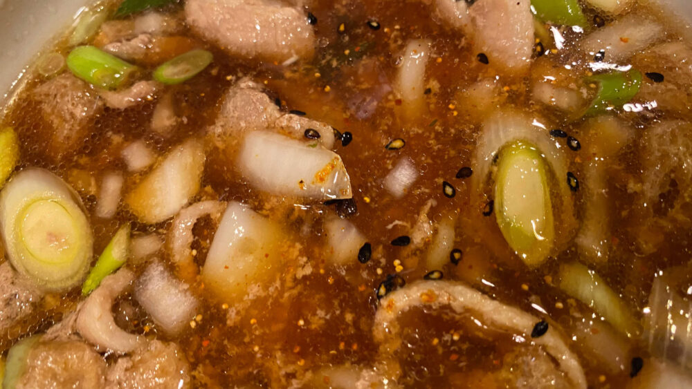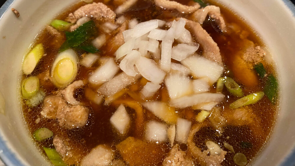 ▲途中、卓上の玉ねぎで味変。ザクシャキ食感がプラスされ、清涼感がアップします。