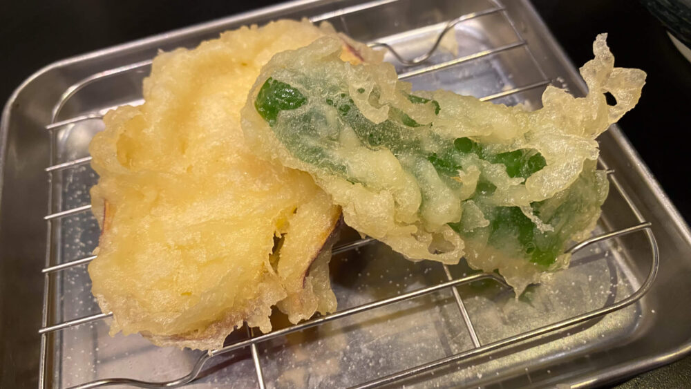 ▲野菜の天ぷらはピーマンとサツマイモ。塩で食べます。
